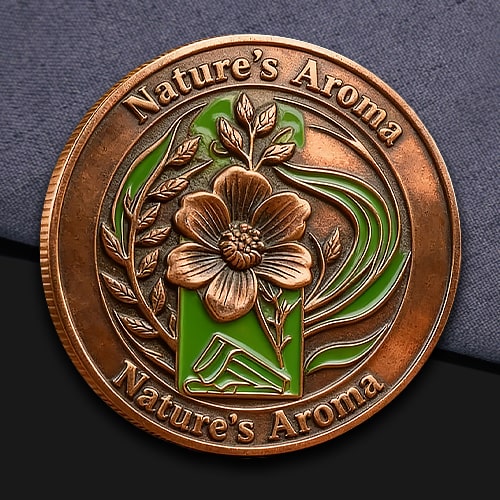 Discover distinction in every detail with Qiyigifts’ Botanical Beauty Corporate Challenge Coin. This striking piece features floral motifs & “Nature’s Aroma” slogan, brought to life with premium metallic and earthy finishes. The botanical-driven design adds symbolic serenity and natural artistry, making each coin a standout token.