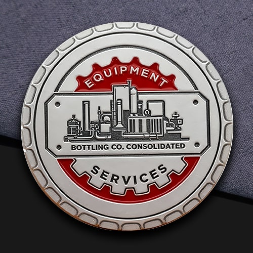 Discover distinction in every detail with Qiyigifts’ Bottling Co. Equipment Corporate Challenge Coin. This striking piece features “Equipment Services” and factory motifs, brought to life with premium metallic and enamel finishes. The industrial design adds symbolic depth and corporate pride, making each coin a standout emblem.