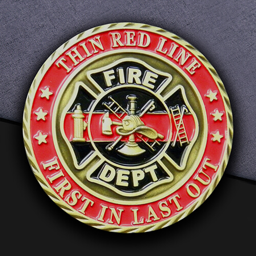 Celebrate firefighting heroism with our Fire Dept Custom Challenge Coin from Qiyigifts. It showcases bold “Thin Red Line” and “First In Last Out” details, symbolizing bravery and duty at the heart of firefighting.