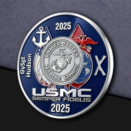 Discover pride in every detail of the USMC GySgt Hudson 2025 Challenge Coin. This eye – catching coin showcases prominent Marine Corps emblems, vividly brought to life with a striking design. The deep blue background, combined with metallic accents, offers visual depth and allure, instantly grabbing attention.